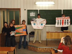 Вот честно: не хочется даже рассказывать про своё выступление, потому что я настолько люблю своих детей и себя, что просто не могу не сказать пару ласковых. По старой привычке первый курс сделал какую-то фигню, которая вполне прокатила под видом «креативной идеи». Товарищ Пафнутий Платонович Перегородиболото, депутат и пароход, ввиду душевной болезни укатил лечиться на родную Украйну, а нам пришлось отдуваться за этого недоделанного Тараса Бульбу. В целом всё получилось очень даже весело: обсудили хорошие и не очень качества преподов нашего факультета, выяснили, что достойная оппозиция нашему правительству Бивис и Батхед, а все конкуренты Пафнутия либо табуретки, либо репки. Единственное, что обрадовало нашу пиарскую братию то, что больной Пафнутий догадался-таки прислать нам целый шмат сала, которым мы и задабривали всех людей прохохляцкой направленности. Одно я точно знаю: для Зацепиной с Ермолаевым это стало самым трогательным и приятным моментом во всей этой вакханалии.